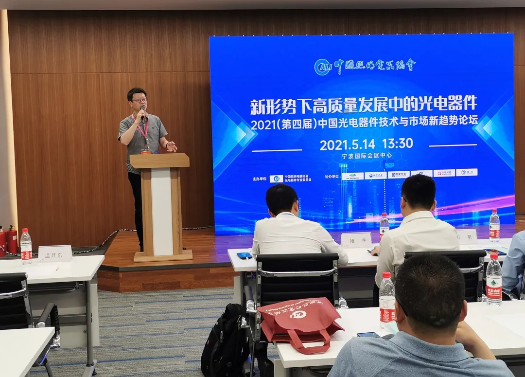 2021年5月14日下午,为了深入研究光电器件技术与市场发展新趋势,促进企业间的技术交流与合作,由中国照明电器协会光电器件专业委员会主办的“新形势下高质量发展中的光电器件”——2021(第四届)中国光电器件技术与市场新趋势论坛在宁波国际会展中心召开。各省市照明行业代表近200人参加。论坛由中国照协副秘书长温其东主持。