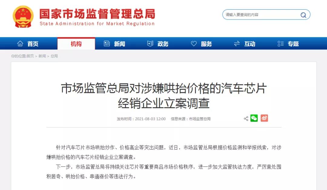8月3日,国家市场监督管理总局官网消息,针对汽车芯片市场哄抬炒作、价格高企等突出问题,近日,市场监管总局根据价格监测和举报线索,对涉嫌哄抬价格的汽车芯片经销企业立案调查。一时间,全网铺天盖地都在发布这一消息。