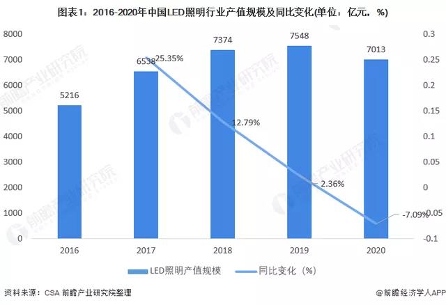 根据CSA的统计,2016-2019年,中国LED照明行业呈现上升趋势,年均复合增长率达到13.1%。2020年我国LED照明行业整体产值达7013亿元,同比下降7.09%。