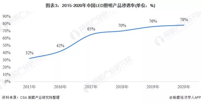 LED灯具有其他灯具无可比拟的优点如体积小、高亮度低热量、环保、可控性强等,目前正广泛应用在各照明领域中。从近年我国LED照明产品国内渗透率来看,LED照明产品国内渗透率(即LED照明产品销售数量/照明产品总销售数量)持续增长。2020年LED照明产品国内渗透率达到78%。较上年度提升了2%。
