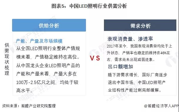 从供给角度来看,我国LED照明行业整体产值规模已超过7000亿元,各环节产值基本保持稳定状态。从需求角度来看,我国LED照明行业的表观消费量逐年增加,产销率也稳定的维持在46%左右,需求尚未出现减弱迹象。综上所述,我国LED照明行业总体仍处于供大于求的情况,产销率基本维持在46%左右,且LED照明行业市场较为饱和。