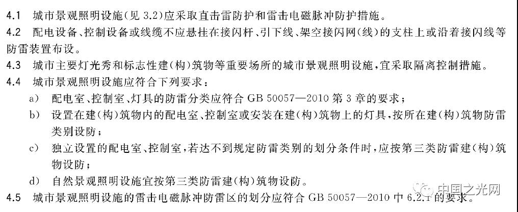 该标准规定了城市景观照明设施的防雷基本要求、直击雷防护、雷击电磁脉冲防护、防雷装置检测方法和维护等,适用于城市景观照明设施的防雷设计、施工、检测和维护。比如,标准规定了城市景观照明设施防雷的基本要求: