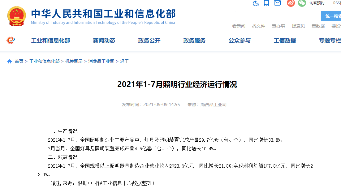 据工业和信息化部9月9日消息,2021年1-7月,全国照明制造业主要产品中,灯具及照明装置完成产量29.7亿套(台、个),同比增长33.8%。7月当月,全国灯具及照明装置完成产量4.6亿套(台、个),同比增长10.4%。