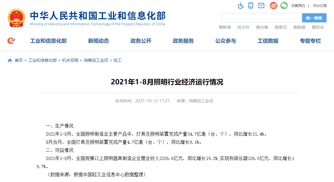 据工业和信息化部10月12日消息,2021年1-8月,全国照明制造业主要产品中,灯具及照明装置完成产量34.7亿套(台、个),同比增长31.4%。8月当月,全国灯具及照明装置完成产量4.7亿套(台、个),同比增长9.1%。