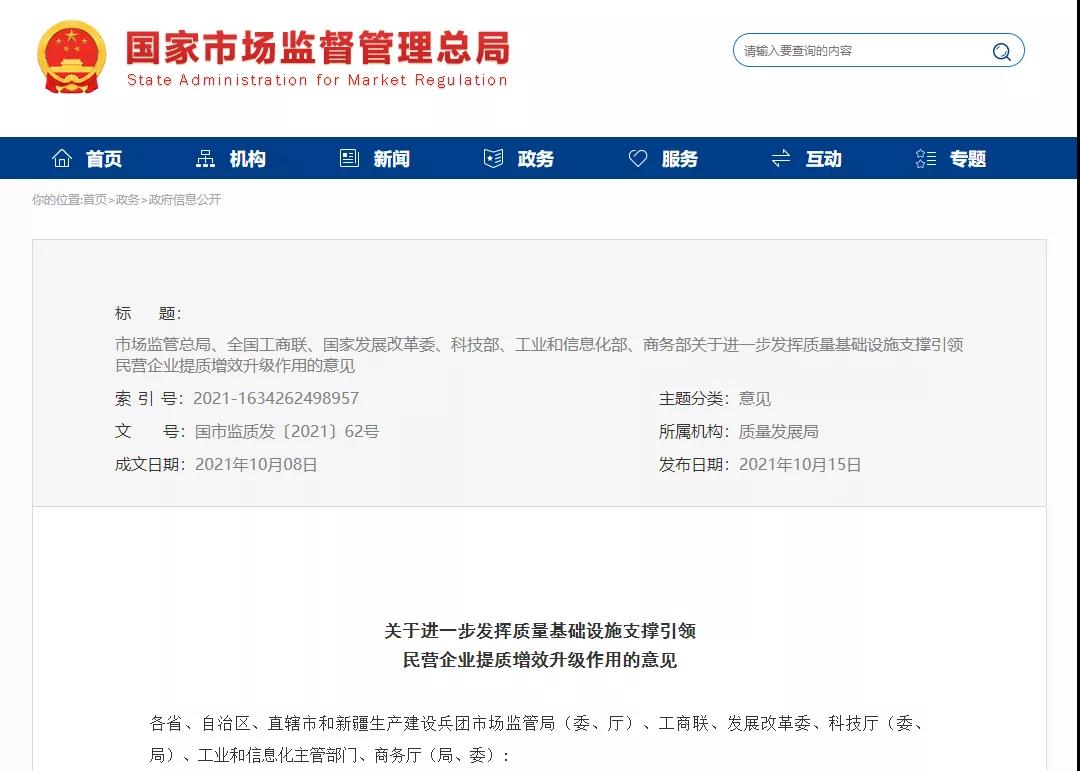 近日,市场监管总局、全国工商联、国家发展改革委、科技部、工业和信息化部、商务部6部门联合印发《关于进一步发挥质量基础设施支撑引领民营企业提质增效升级作用的意见》(以下简称《意见》),综合运用质量政策、产业政策、科技政策、外贸政策、监管政策等手段,支持民营企业提质增效升级,切实以公正监管促进公平竞争、以质量政策推动质量提升。(获取《意见》全文,可点击下方“阅读原文”)