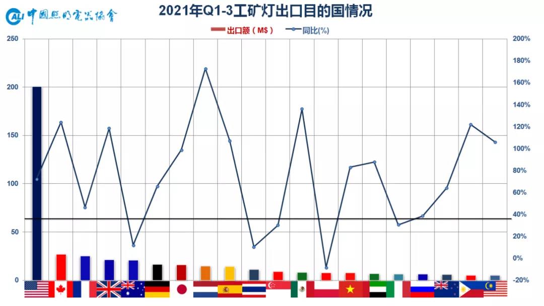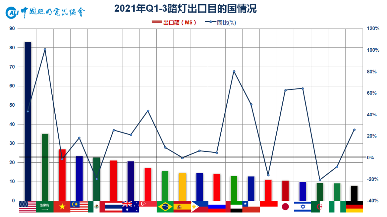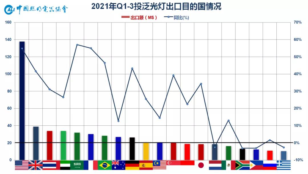 投泛光灯出口目的国,前二十市场占整个出口市场的60%,其中美国市场占整体的14%。