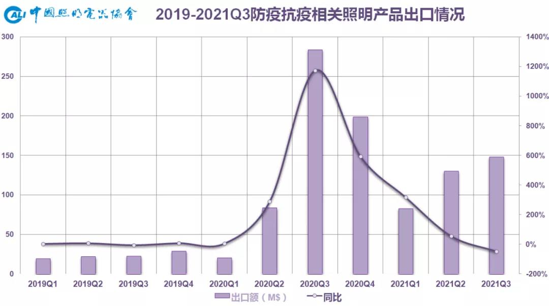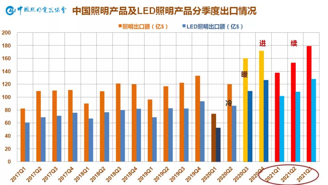 中国照明产品出口继经历了2020年先抑后扬的“V”字型反转之后,在2021年维持了高歌猛进的态势。比起一季度的超高增长,二季度明显呈现增幅逐月收窄的状况,三季度则势头又有所回升。走势既和去年对比基数变化情况相关,也受海外疫情反复的影响。2021年前三季度照明出口保持增长原因在于: