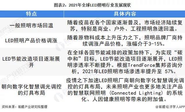 在经历了2020年全球疫情对LED照明行业的重创后,随着疫情逐步得到控制,商业、户外、工程照明急速回温。同时据TrendForce分析,LED照明渗透率将有所提升。除此以外,LED照明行业还呈现LED照明产品价格调涨及朝向数字化智慧调光调控发展的特点。