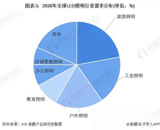 从全球LED照明行业需求分布来看,家居照明占比超过20%,应用最广。其次是工业和户外照明,均在18%左右。