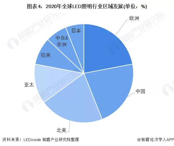 据LEDinside最新数据显示,2020年,中国仍是世界上最大的LED照明市场,与中国并列的有欧洲,北美紧随其后。中国、欧洲、北美占比之和超过全球LED照明市场六成,区域集中度较高。