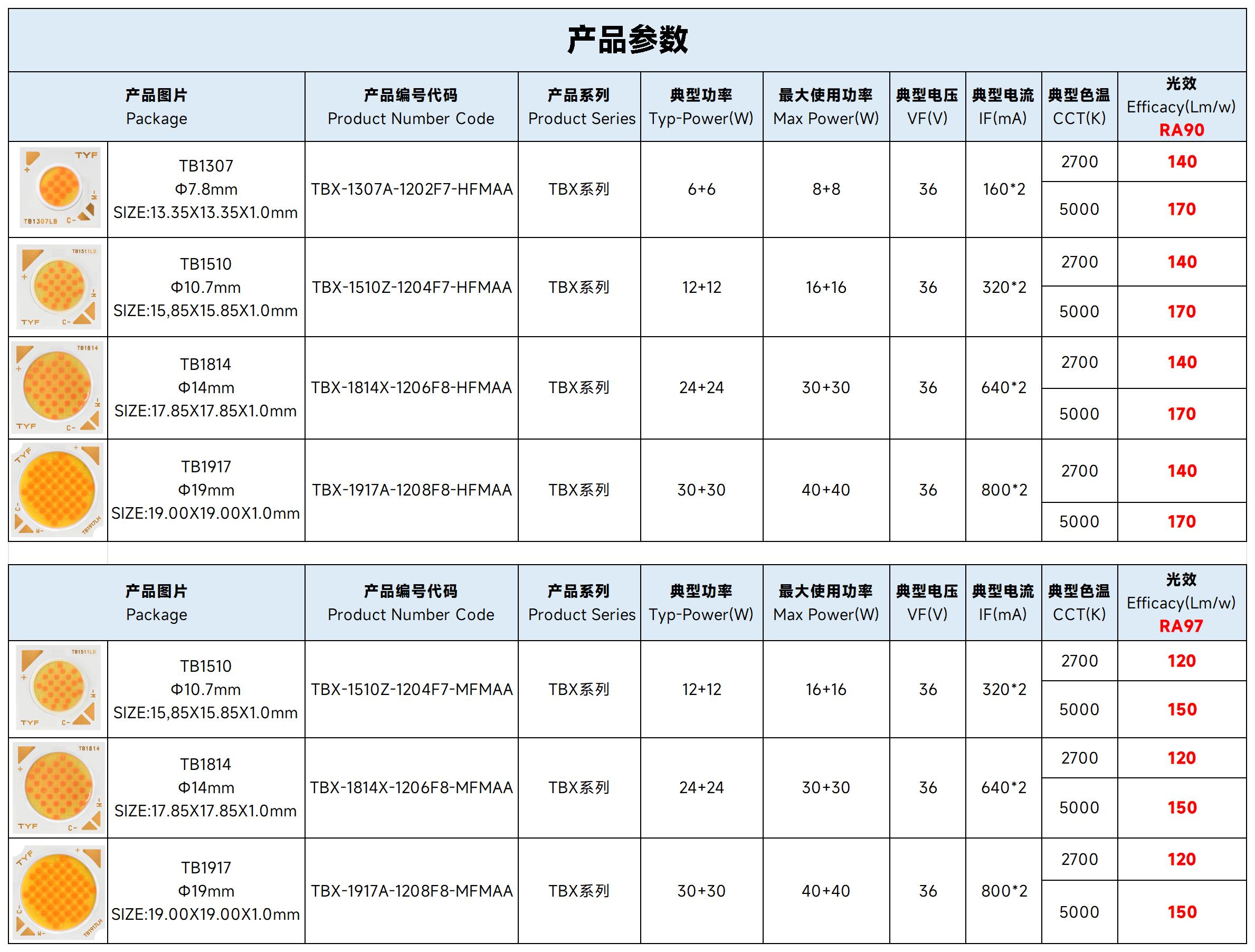 在“双碳”目标持续推进与消费需求升级的双重驱动下,市场对LED照明产品在能效、光品质与智能化方面提出了更高要求。TYF同一方高光效TBX系列双色COB,以150Lm/w高光效+Ra97高显色双突破,节能更优、光感更佳,实现97显指的同时,光效可以达到常规90显指的光效标准,为高端商业照明、专业场景及智能照明系统提供了高性能、可持续的解决方案。