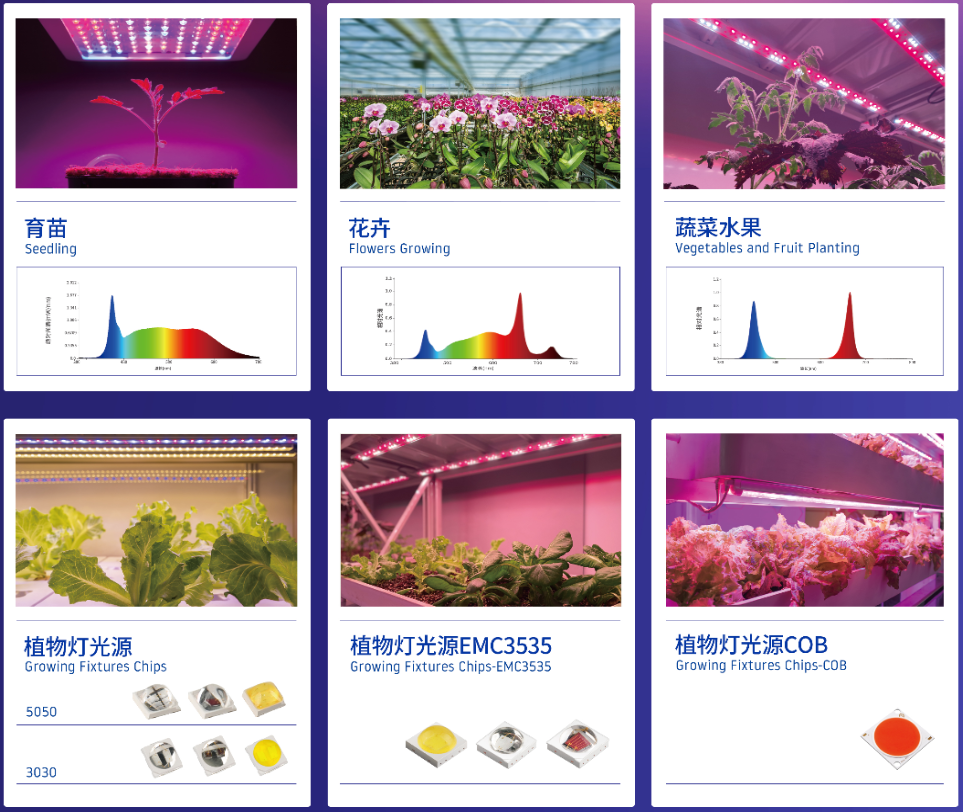 产品主要采用当下主流的“白光+红光”配光方案,其中白光产品系列的光合光子通量效率(PPE) 65mA测试 3.1 μmol/J,红光产品系列PPE 350mA测试高达4.2μmol/J。