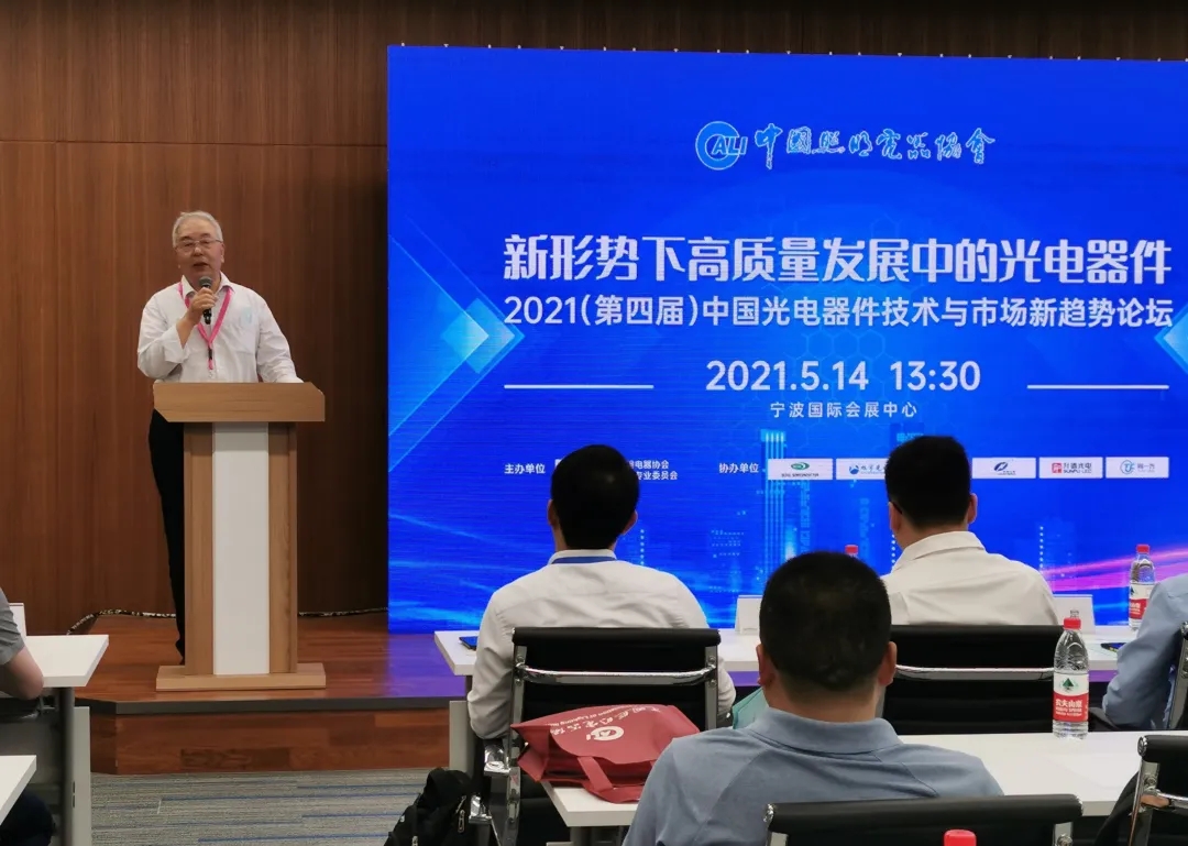 2021年5月14日下午,为了深入研究光电器件技术与市场发展新趋势,促进企业间的技术交流与合作,由中国照明电器协会光电器件专业委员会主办的“新形势下高质量发展中的光电器件”——2021(第四届)中国光电器件技术与市场新趋势论坛在宁波国际会展中心召开。各省市照明行业代表近200人参加。论坛由中国照协副秘书长温其东主持。