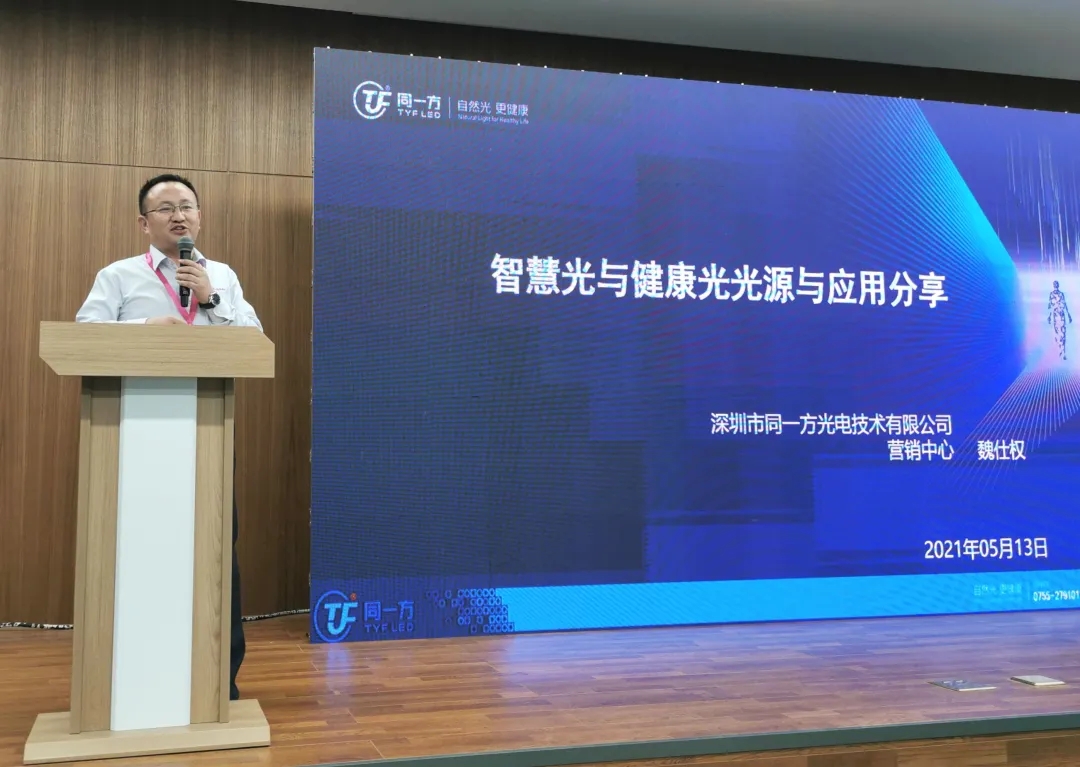 深圳市同一方光电技术有限公司营销总经理魏仕权做了《智慧光与健康光光源与应用分享》主题报告,从“光”的管控角度,介绍了同一方第一代到第七代双色COB、SMD产品的应用与特性以及同一方2.0智能时代在LED细分应用领域的布局。