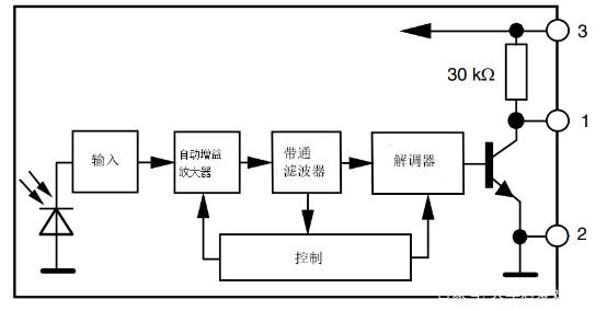 如图是LED红外接收头内部结构方框图,内部集成了自动增益放大器、带通滤波器、解调器等电路,有些还包含限幅电路、比较器以及积分器等,因此一个小小的接收头其实内部集成了不少电路。
