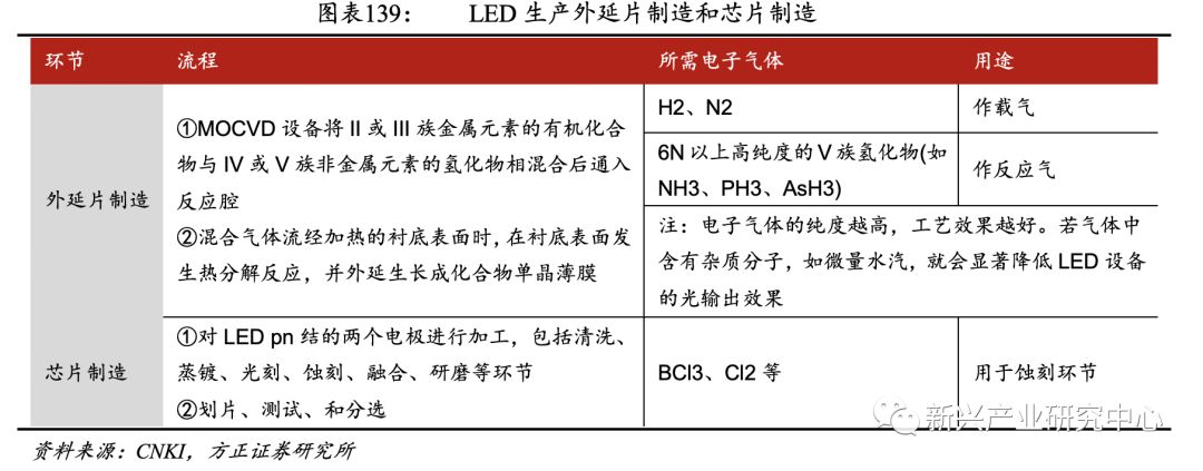 在LED领域,特种气体主要应用于LED外延片和芯片的制作过程。LED主要生产流程包括:外延片生长、芯片加工以及封装应用,电子特气主要应用于外延片生长和芯片的加工芯片。