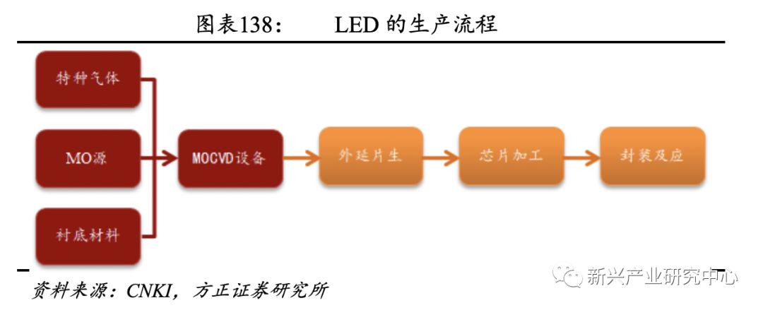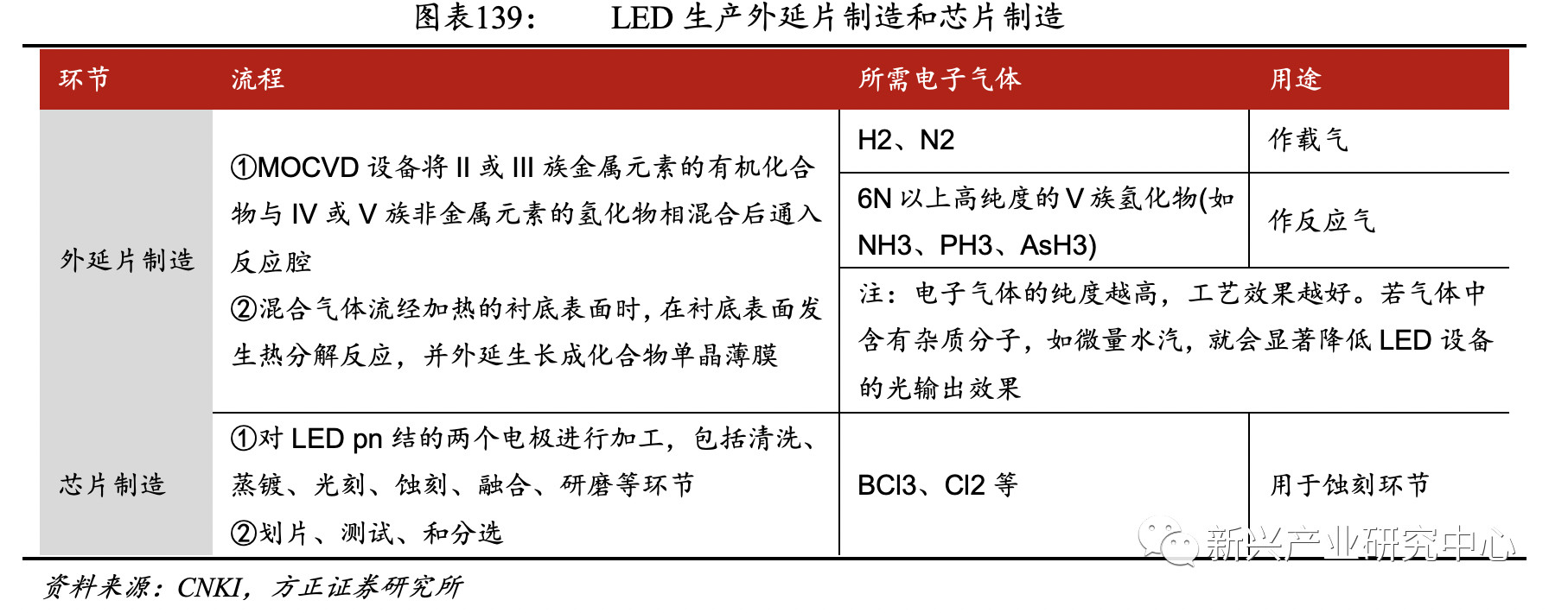 在LED领域,特种气体主要应用于LED外延片和芯片的制作过程。LED主要生产流程包括:外延片生长、芯片加工以及封装应用,电子特气主要应用于外延片生长和芯片的加工芯片。