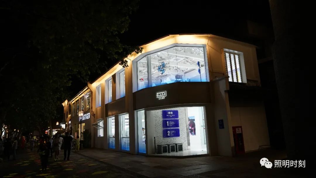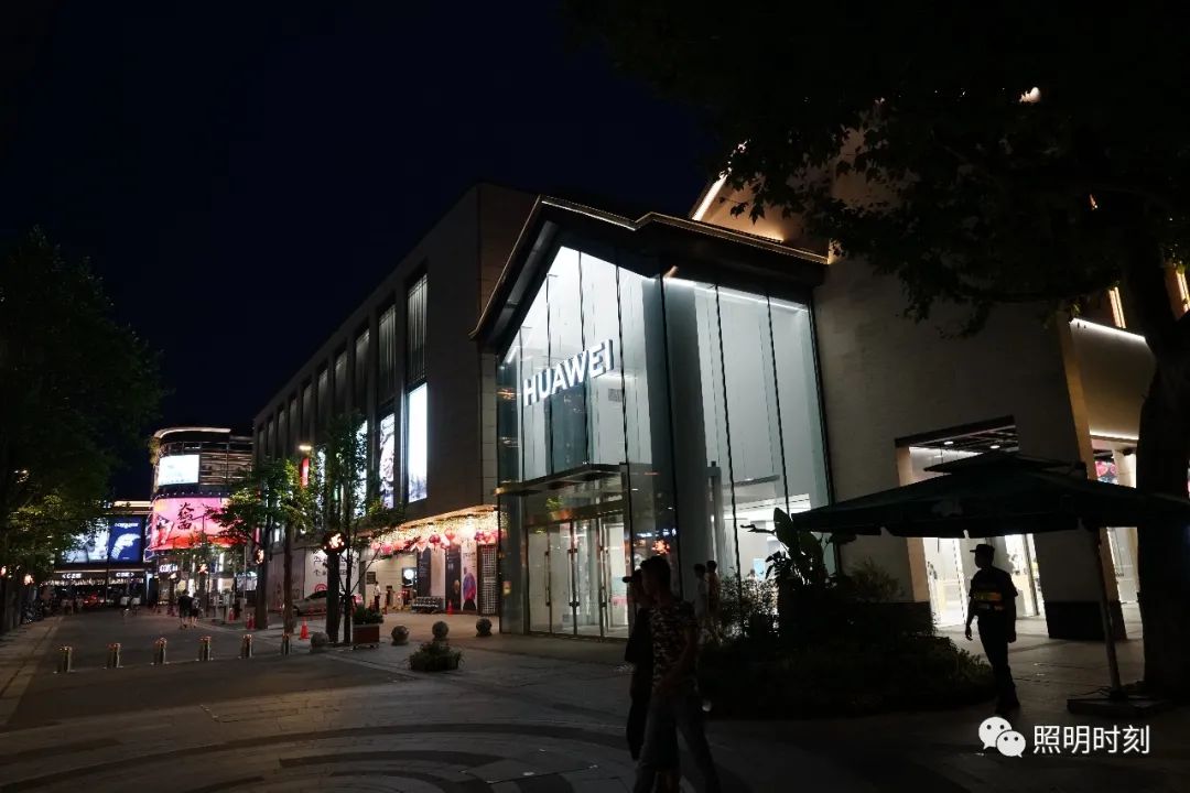临街店铺的内透光,往往更让我们惊艳。店铺的内透光不是以窗户为单位的,而是整体的。它就在近人的眼前,不需要抬头去看,它往往是明亮的、均匀的、通透的、见光不见灯的。内透光把橱窗里的商品展示给我们,因此,这种整体的惊艳,已不仅仅是灯光本身,还包括了橱窗的布置、商品的展示,美感是整体呈现给我们的。这种晚上的呈现比白天的呈现效果要好得多——白天的橱窗并不明显,它还会受到日光的干扰。到了夜晚,橱窗在灯光的渲染下,成为路边最靓丽的风景。